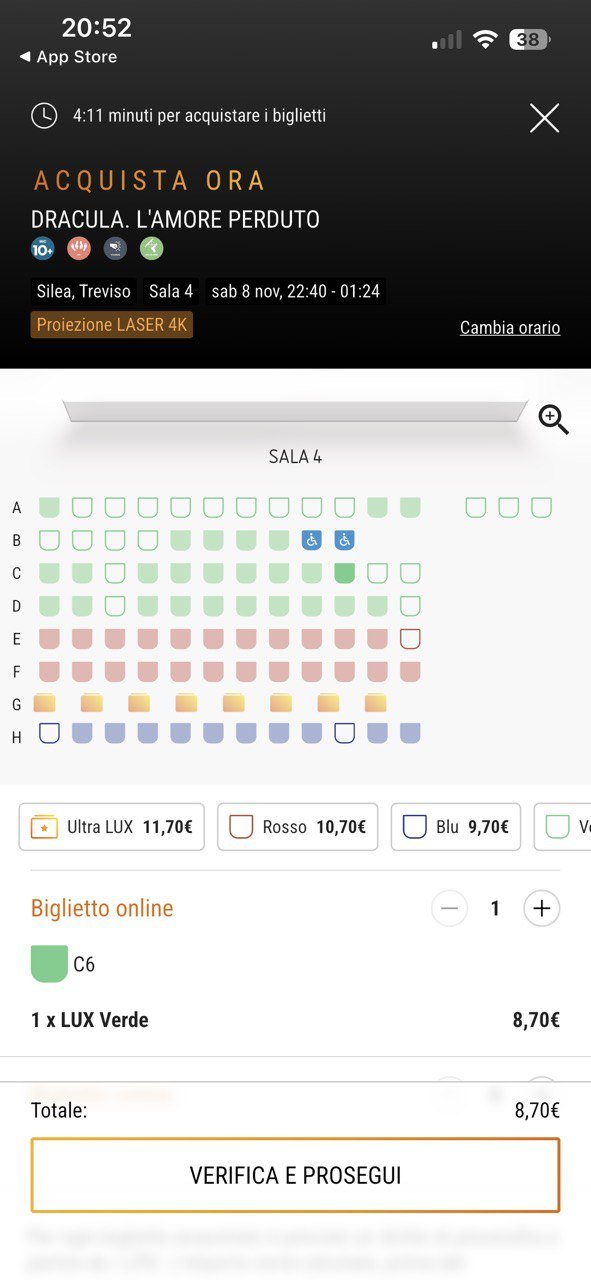 Nel menu di navigazione inferiore è presente una funzione di “Acquisto rapido”, che consente di prenotare un biglietto in pochi passaggi. L’utente può selezionare il cinema più vicino (geolocalizzato automaticamente), scegliere il film, la data e l’orario direttamente da un carosello interattivo, e procedere alla selezione dei posti. La mappa della sala mostra poltrone con prezzi differenziati in base a posizione e comfort, rendendo trasparente la logica di tariffazione. Questo flusso è lineare e ben ottimizzato per l’uso mobile, riducendo al minimo la complessità cognitiva nel processo di acquisto.