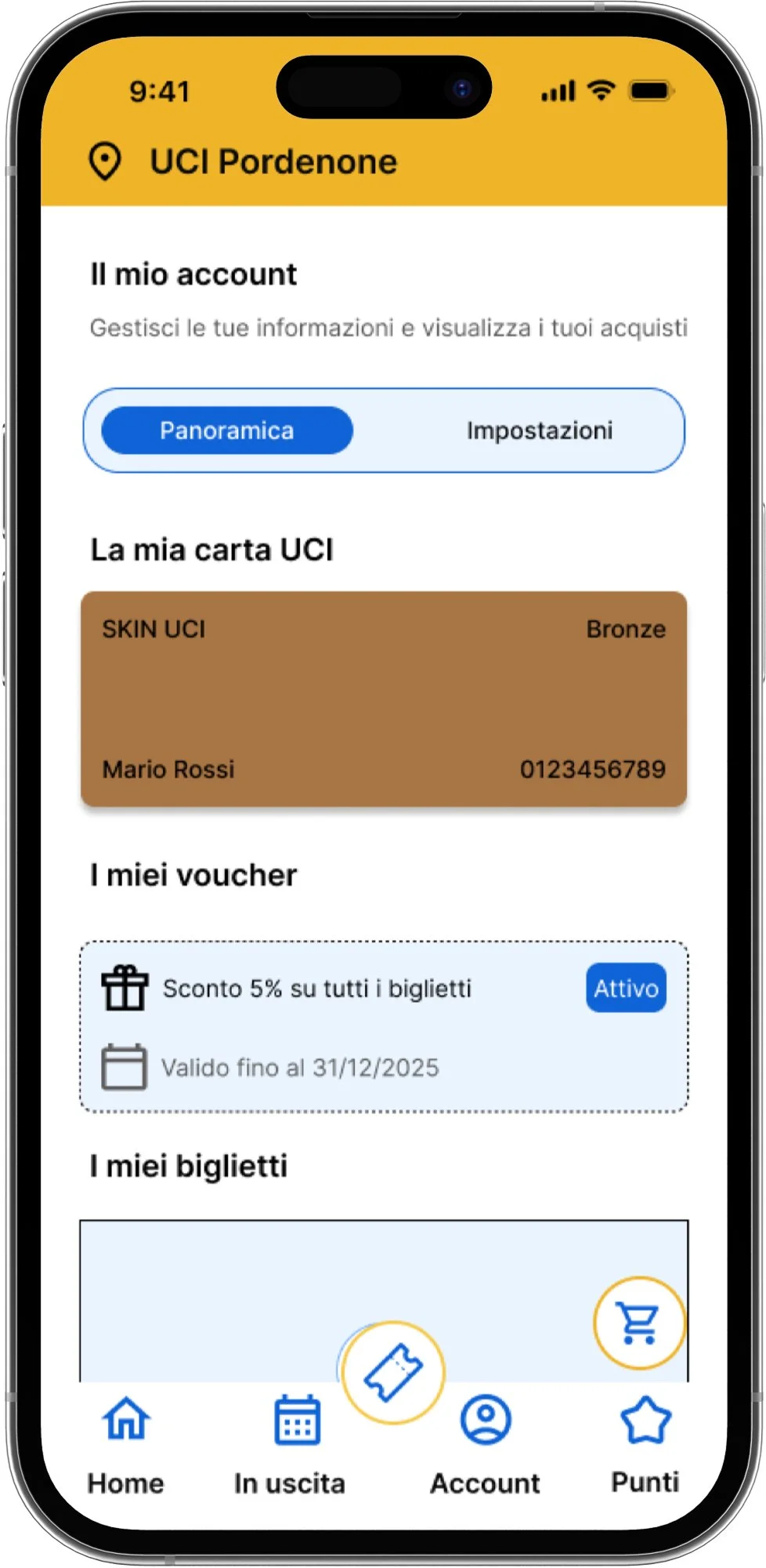 La carta UCI è visualizzata in modo immediato e riconoscibile, con livello fedeltà e identificativo sempre visibili, eliminando la necessità di navigazioni secondarie.